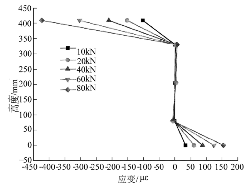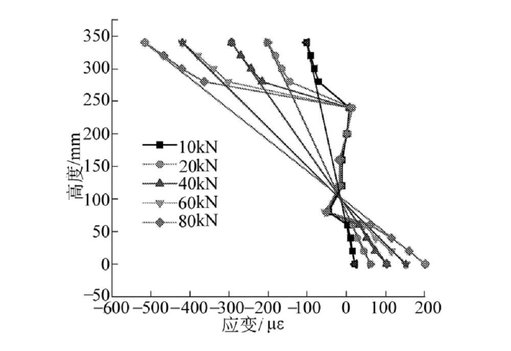 接近波纹钢腹板的顶底板时, 各截面纵向应变均较虚拟平面偏小, 且梁体所受荷载越大越明显, 说明在混凝土顶底板与波纹钢腹板接触面附近, 波纹钢腹板提供了一定的抵抗力.