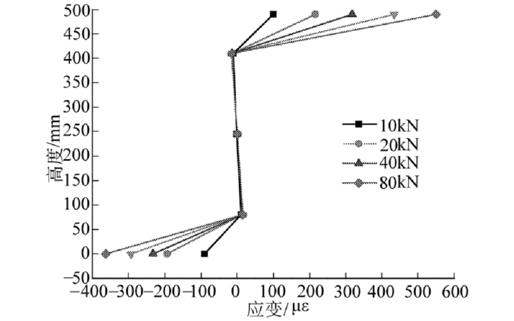 由以上分析可以看出, 由于纵向的褶皱效应明显, 波纹钢腹板在沿纵桥方向上的应力值近似于零, 因此波纹钢腹板对组合箱梁纵向弯矩的抵抗作用可以忽略不计[8], 研究截面抗弯时, 将腹板上的各测点去掉, 混凝土顶底板的应变连线近似在同一直线上, 组成1个虚构的平面, 该情况可视为近似符合“ 平截面假定” , 所以“ 拟平截面假定” 可以引入到截面受弯变形的理论计算之中.