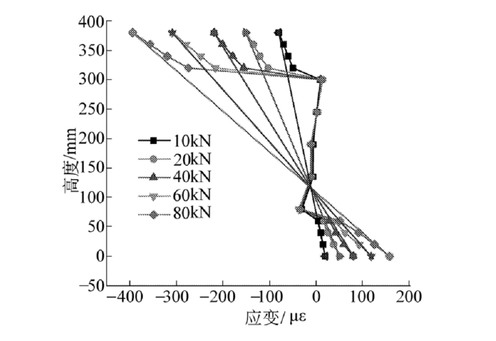 结合有限元模型, 提取不同加载等级下变截面波纹钢腹板刚构桥中跨1/2、3/8、1/4截面和中跨支座截面沿梁高度加密后各点的纵向应变如图13~图16所示.