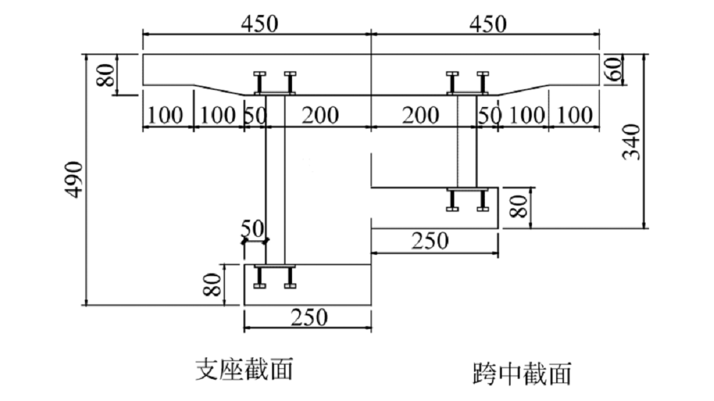 模型梁体类型采用单箱单室, 在梁体端部和桥墩上部梁体内布置混凝土横隔板, 主梁的构造如图1所示.波纹钢腹板箱梁支座处和中跨跨中横截面详细尺寸构造如图2所示.