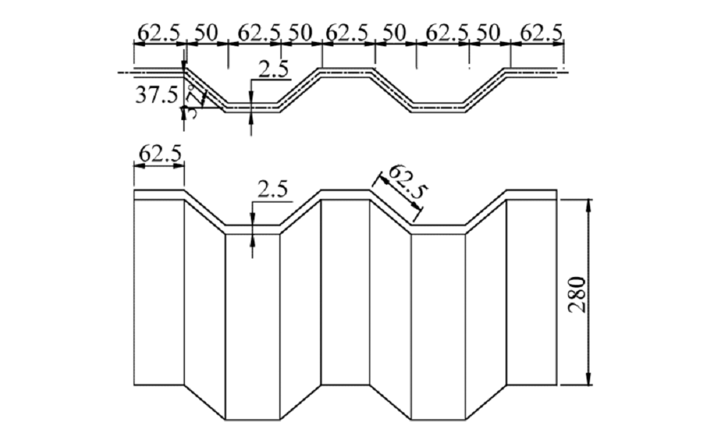 波纹钢板在工厂中制作而成, 其详细几何参数如图3所示.波纹钢腹板与混凝土顶底板之间用剪力钉连接, 其规格为GB/T 10433 13× 40.