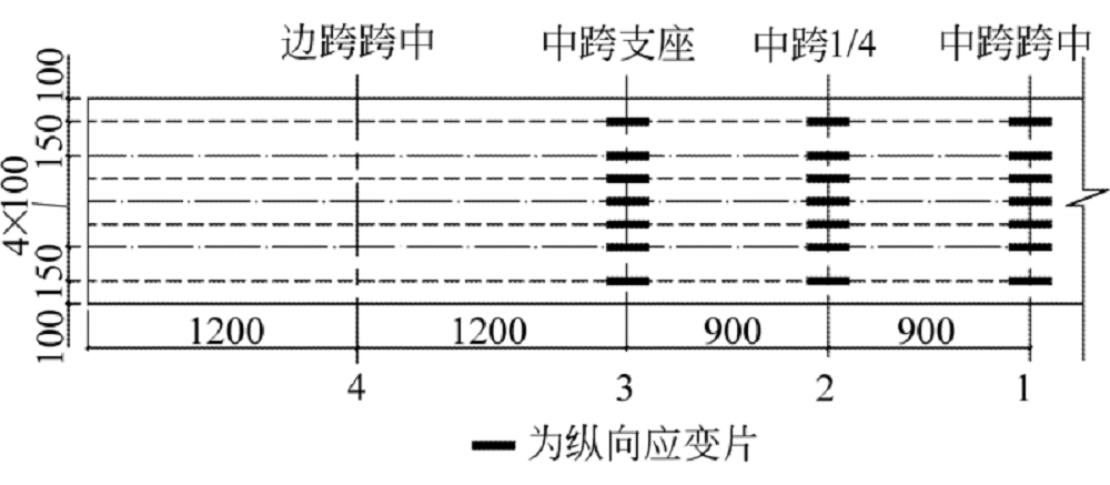 3) 试验梁中跨3/8、1/4截面沿梁高度各测点纵向应变趋势与1/2截面基本一致, 中跨支座截面沿梁高度各测点纵向应变与中跨1/2、3/8、1/4截面相反, 且顶底板应变基本相同.