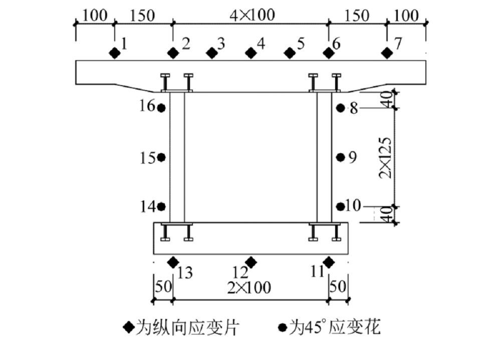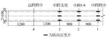 使用静态数据采集系统DH3815和DH3816测量应变, 波纹钢腹板箱梁的顶板、底板粘贴纵向应变片, 钢腹板粘贴45° 三相应变花.图4和图5为箱梁的顶板、底板纵向应变片布置情况.波纹钢腹板箱梁横断面应变测点布置如图6所示, 顺时针方向依次编号为1~16#测点.