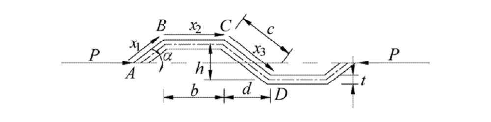 由于波纹钢腹板构造形态呈波折型的特点, 在轴向力P的作用下具有“ 手风琴” 效应, 容易被压缩, 沿轴向力方向的变形较大, 其几何尺寸标注如图8所示.