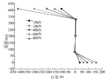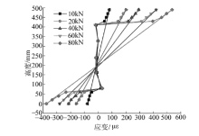 | 图10 试验桥梁中跨1/4截面纵向应变沿梁高度分布Fig.10 Longitudinal strain distribution along height of 1/4 section of test bridge |