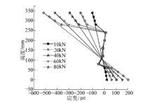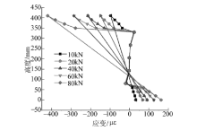 通过上述的试验方案, 可以得出在不同等级对称荷载作用下, 波纹钢腹板三跨连续刚构桥试验模型中跨1/2、1/4截面和中跨支座截面沿梁高度方向上各测点的纵向应变如图9~图11所示.