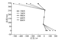 | 图14 有限元模型桥中跨3/8截面纵向应变沿梁高度分布Fig.14 Longitudinal strain distribution along height of 3/8 section of bridge finite element model |