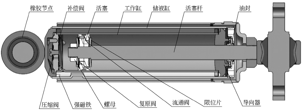 减振器长时间工作后, 活塞与工作缸摩擦剧烈, 因温度过高, 会产生减振器卡死现象, 从而造成减振器失效.当紧固阀片的螺母产生松动时, 阀片预紧力产生影响, 从而影响阻尼力.当阀片多次弯曲后会产生变形甚至折断, 使减振器失效.