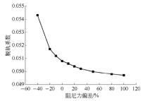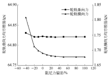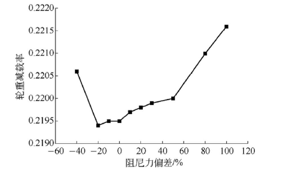 由图12可以看出轮重减载率随阻尼力偏差变化趋势, 当阻尼力偏差在-20%~50%时, 减载率缓慢增加, 阻尼力偏差在-20%时达到最优值0.219 4, 小于-20%和大于50%阻尼力偏差时都有相对恶化趋势, 尤其当阻尼力偏差降低到-50%时, 此时的轮重减载率为0.320 0.
