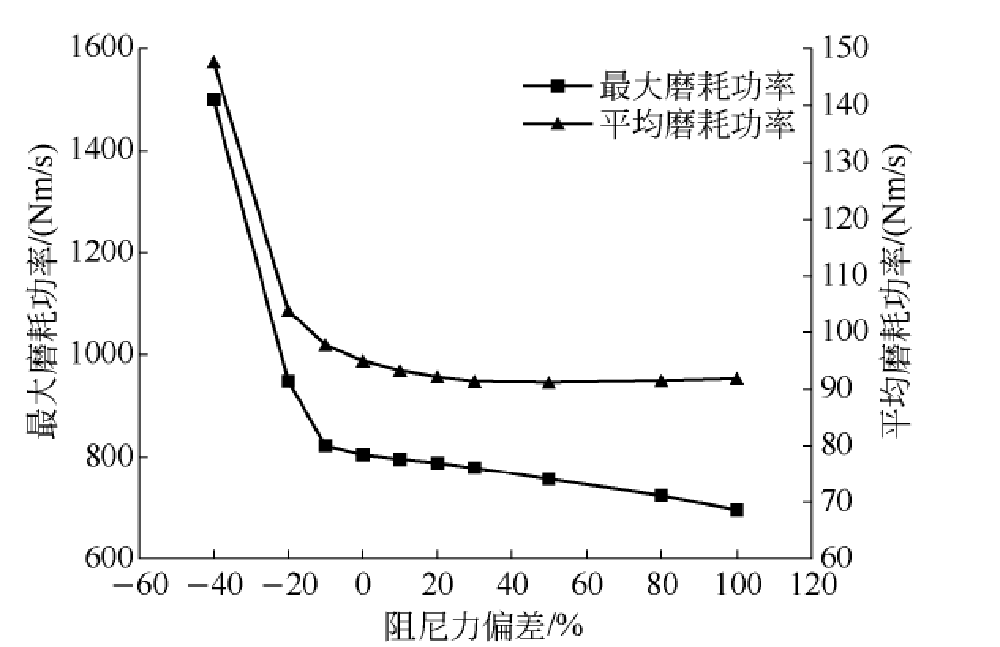由图14可以看出轮轨磨耗的趋势和脱轨系数趋势相同, 轮轨平均磨耗功率在-40%~100%阻尼力偏差下总体变化为37.63%, 在-50%偏差时平均磨耗功率更是增大到1 950 Nm/s.可见抗蛇行减振器阻尼力对轮轨磨耗的影响较大.