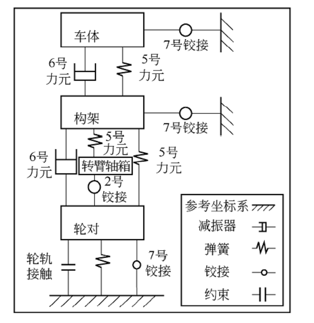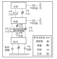 车辆系统拓扑图如图8所示, 系统由4条轮对、8个转臂轴箱、2个构架和1个车体组成, 共50个自由度.其中, 轮对、构架、车体分别与总参考坐标系用7号铰接相连, 7号铰接用于描述轨道车辆的6自由度部件(轮对, 构架, 车体等)沿着轨道在空间中的运动.一系悬挂和二系悬挂均用5号和6号力元表示, 5号力元用于描述弹簧、阻尼并联的单点重合力; 6号力元用于描述弹簧、阻尼串联且具有一定距离的力.转臂轴箱与轮对用2号铰接相连, 2号铰接用于描述只绕x轴转动的单自由度运动.转臂轴箱与构架用5号力元连接.