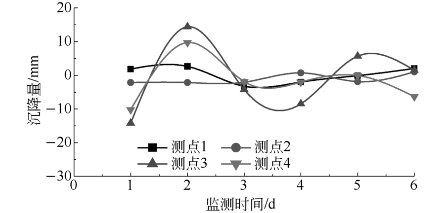 对施工进行全过程监测, 依靠监控数据指导施工, 密切注意监测值的变化情况, 当出现异常时, 及时分析, 采取措施处理.箱涵顶进完成后, 立即在箱涵与管幕间压注固化泥浆材料, 使得箱涵与管幕之间的触变泥浆及时固化, 以减小地表后期沉降.图12给出了实际监测到的箱涵顶进过程铁道沿线地表监测点沉降情况, 其中监测点布置如图1所示.