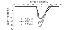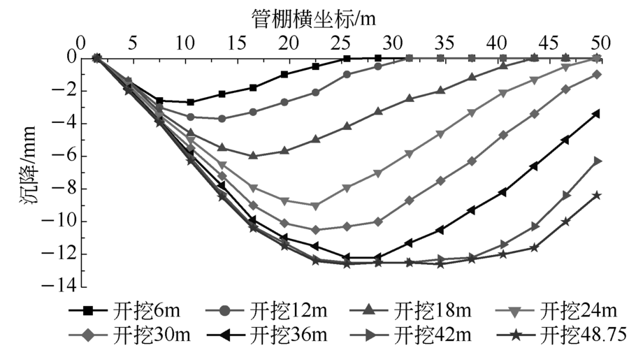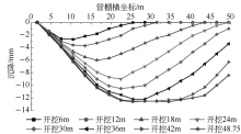 图5给出了上部管幕随箱涵顶进开挖过程的沉降情况.随着箱涵的推进, 管幕的最大挠度不断前移, 挠度在不断增加.
