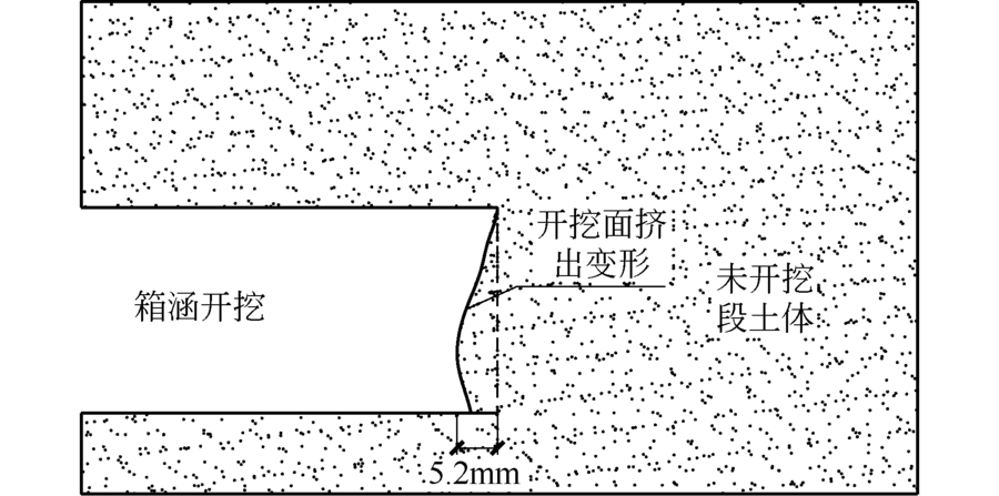 在实际施工中, 严格掌握挖土量, 底板和侧刃角必须吃土顶进, 挖土坡面不陡于60° .根据开挖面地层变形规律, 挖土时先挖两侧, 后挖中间, 形成向洞内凸入弧形, 确保路基不发生塌方, 保证运行安全, 待箱体就位, 一次挖净.