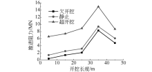 3)控制箱涵顶进速度和顶进力, 保证开挖面的稳定性.根据箱涵的顶进速度和开挖出土速度, 有欠开挖、静止和超开挖3种情况, 计算分析表明[14, 15], 箱涵推进速度的快慢直接影响着正面阻力的大小, 箱涵以较慢的速度推进时所受的推进阻力最小, 如图11所示.因而, 从对箱涵施加推力大小的角度考虑, 以较慢的速度推进箱涵是最为合理的, 实际测得的最大总推力为13 MPa, 符合欠开挖模式.