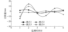 由图可见, 箱涵顶进过程沿铁轨沿线地表沉降控制在15 mm以内, 箱涵中轴线上路基沉降值较大, 离箱涵中轴线越远监测点沉降越小.箱涵顶进会引起沿铁路线路方向的沉降差, 施工中应根据这些监测信息及时配合铁路工务的起道, 保证列车运行的安全.
