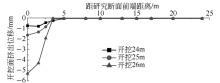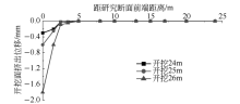 箱涵顶进施工过程中管幕的沉降源于开挖面前方土体的松动变形, 图7给出了开挖26 m时开挖面前方地层变形情况.由图可见, 开挖面前方一定范围土体发生了松动变形, 并导致开挖面发生挤出变形.