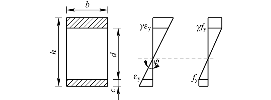 轴向偏心荷载作用下, 图1所示钢压杆弹塑性失稳时截面的应变沿截面高度分布符合平截面假定, 应力、应变分布情况如图2所示.