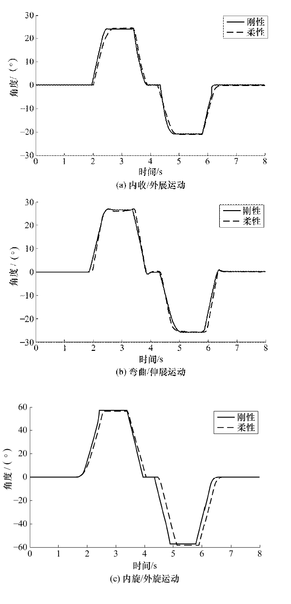 1)运动过程中柔性手腕相比刚性手腕具有一定的滞后现象, 这是由于柔性手腕中SEA弹性模块的存在使得电动推杆在驱动时首先要压缩弹簧产生变形, 通过弹簧力将动力输出到动平台.