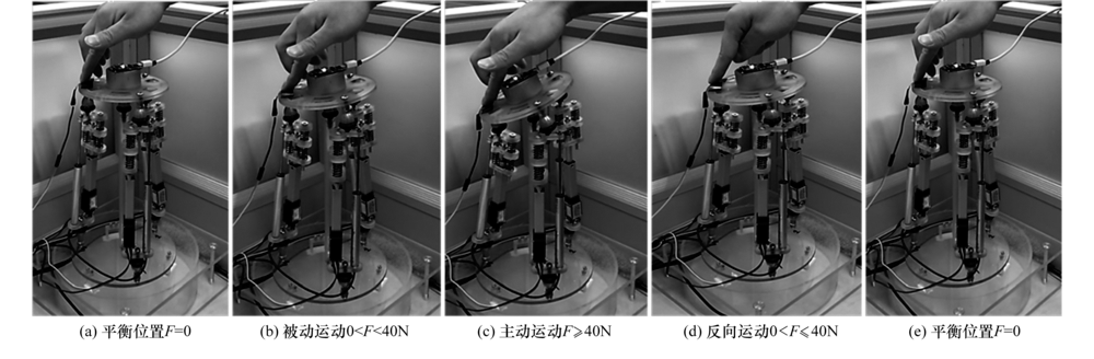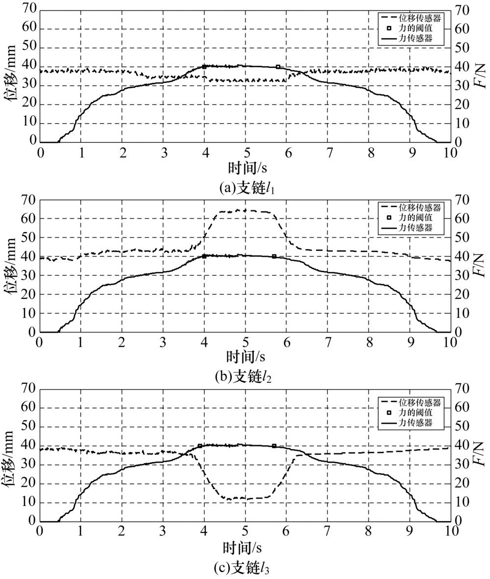 为了验证并联柔顺手腕的柔顺性, 在并联柔顺机械手腕动平台边缘施加力, 如图6所示, 力的大小通过薄膜压力传感器测量, 直线位移传感器用于测量各支链的位移变化.通过施加力反馈控制, 设定施加力