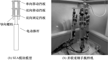 将电动推杆与弹簧组结合, 设计一款直线型双串联线性弹性驱动器作为并联手腕的驱动装置, 实现柔顺化, 弹簧与挡板通过圆形凹槽过盈配合, 螺栓选用的是半螺纹螺栓, 单向移动挡板由于螺栓的作用只能向下移动, 双向移动挡板在电动推杆的驱动下可以上下2个方向移动, 双向固定挡板与螺栓通过螺纹连接, 与螺栓的相对位置保持不变.SEA三维模型以及并联柔顺手腕样机如图2所示, 可实现2种运动模式, 具有双向柔顺性.