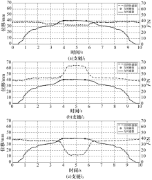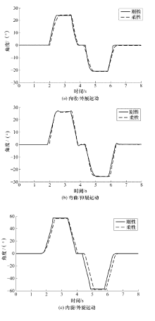 并联手腕的姿态控制是已知末端姿态的情况下, 根据运动学逆解公式求得驱动支链的位移, 并用于微型电动推杆的运动控制, 使末端动平台达到期望姿态.相比刚性手腕, 柔性手腕由于弹性环节的存在使得末端输出可能存在偏差, 本文将微型位移传感器与驱动支链并联, 通过柔性手腕的反馈环节, 根据微型位移传感器的测量值补偿电动推杆的输出以实现期望的动平台末端姿态.为了评价柔性手腕的位姿调整能力和控制策略的可行性, 通过实验对比了刚性手腕(弹簧换做刚性元件)和柔性手腕的姿态调整能力, 末端姿态通过姿态仪测量.手腕的运动如图4所示, 刚性条件下和柔性条件下3个自由度的运动曲线如图 5所示.