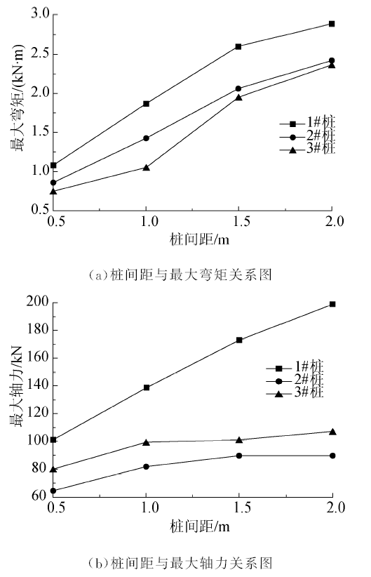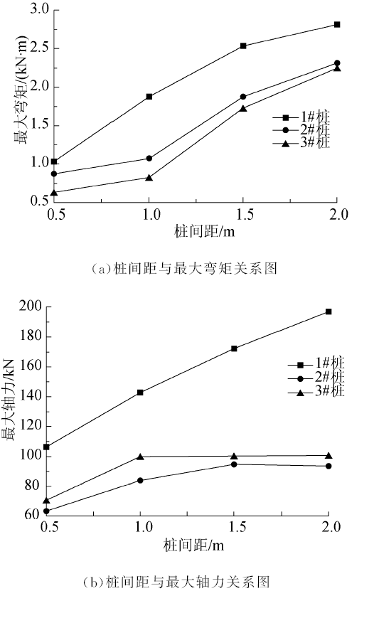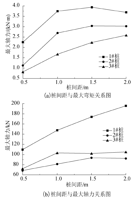 由试算可知, 在桩周土体屈服时, 群桩在2 m的间距范围内荷载分担比约为1∶ 1∶ 1, 采用上述荷载分担比例, 对独立式微型桩桩周土体屈服, 滑坡发生前荷载作用下桩体的最大内力分布规律进行计算分析.图8为独立式微型桩在矩形布置的情况下桩身最大内力与桩间距之间的关系图.由图8(a)可知, 独立式微型桩各桩的受力受桩间距影响较大, 桩间距1.0 m以下时群桩的联合抗弯效应最好, 超过1.0 m后3根桩表现为滑坡推力先作用到的桩弯矩较大, 其余两桩弯矩相对较小.由图8(b)可知, 桩身最大轴力同样反映出这一规律, 各桩最大轴力受桩间距的影响较明显, 1#桩桩身轴力随桩间距增大而明显增大, 2#、3#桩的桩身轴力随桩间距的增大表现出增大后趋于平稳的趋势.这可能是由于桩直径较小, 当平行布置微型桩时, 桩土介质协同受力的影响范围不会超过2 m, 所以当矩形布置的微型桩桩间距过大时, 群桩协同受力的效果就不再明显.