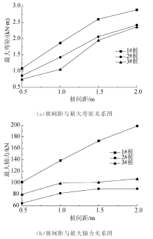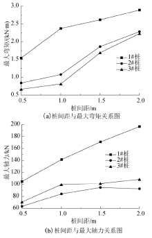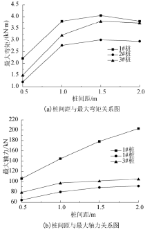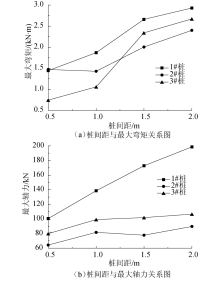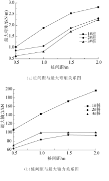 | 图11 连系梁式微型桩梅花形布置时内力与桩间距关系Fig.11 Relationship between the maximum internal force and pile spacing when micropile with coupling beams arranged in plum blossom shape |