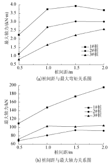 | 图13 承台式微型桩梅花形交错布置时最大内力与桩间距关系Fig.13 Relationship between the maximum internal force and pile spacing when micropile with pile caparranged in plum blossom shape |