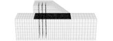 建立模型的主要问题在于桩前土体边界条件的选取, 本文在参考现有模型的基础上优化、改进并建立模型, 每一种群桩组合体系的边界条件通过试算法校验确定, 最终所建计算模型见图5.外围模型一次性建立, 微型桩不同的群桩类型可通过FLAC3D内置的结构单元实现, 其中桩采用pile单元模拟, 连系梁采用beam单元模拟, 承台采用shell单元模拟.边界荷载的施加是通过先将边界施加约束, 然后在边界上施加速度荷载来实现.