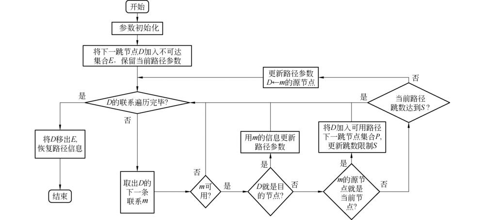 考虑到网络规模和场景需求, 在路由计算的过程中加入多个分支限界条件, 排除不可用联系, 并通过合理的跳数限制(命名为