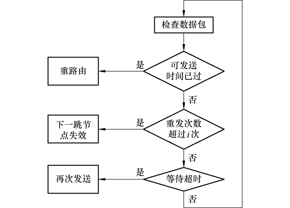 问题 2), 是影响网络重构的重要问题, 本文需要在多种转发失败的情况中筛选出它与其他问题的不同, 从而准确地对网络结构做出改变.为此, 在2.1节基本保证数据转发的措施中, 加入对重传次数的限定.即便空间网络环境中存在一些不可控因素, 但在设备功能正常且多次重传的情况下, 转发失败的情况基本不会发生.因此采用图4所示的流程, 将失效节点的感知整合到重路由和超时重传的检查过程中.