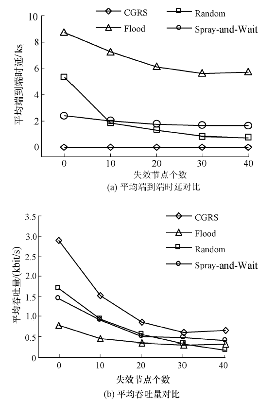 图9是各路由方法在不同失效节点个数时的网络性能对比.Flood路由在时延和吞吐量上性能最差.相比之下, Spray-wait算法在参考Flood算法的情况下作了改进, 一定程度上提高了网络的性能.本文仿真实验中, 联系图路由虽然以跳数最短为择路标准, 但在时延和吞吐量方面也具有更好的性能, 与其他算法相比在路由性能上有着明显的优势.
