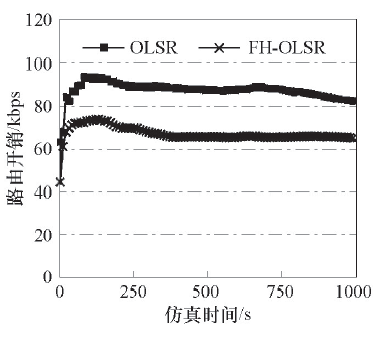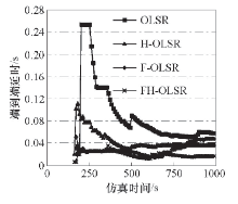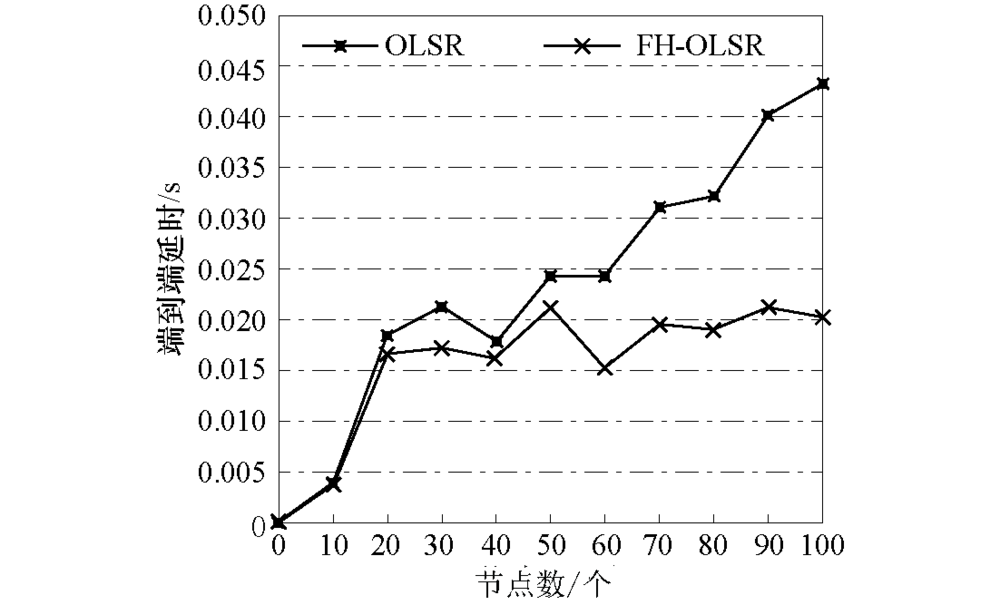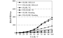 如图6和图7所示, 随着节点数目的增加, 路由开销与延时逐渐增加.当网络节点数高于50时, FH-OLSR的性能明显优于OLSR, 路由开销降低了约60%, 延时维持在0.02 s左右.这是因为网络规模越大, 网络层产生的数据就越多, 路由开销就越大, 信道就越易堵塞, 从而增加延时, 降低网络性能.