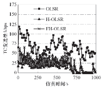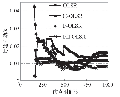这说明在大规模网络拓扑变化快的场景中, OLSR协议的路由具备高失效性, 并且消息越多, 网络就越易堵塞, 时延自然会高, 抖动也越厉害, 丢包率也随之增加, 而FH-OLSR协议通过改进消息发送机制, 有效地提升了网络性能.