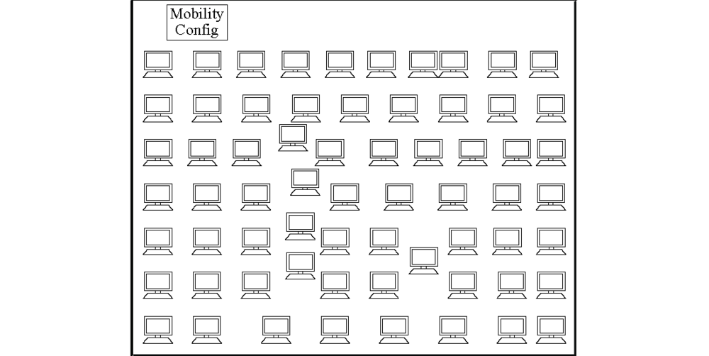 首先下载安装OPNET14.5这个实现了标准OLSR协议的软件包, 并对仿真参数进行设定, 节点的传输半径为1 km, 信道传输速率为11 Mbps, 业务数据速率为16 kbps, 节点每秒发32个包, 传输层使用UDP协议, MAC层使用IEEE802.11b协议.构建如图5仿真场景, 网络区域为20 km× 20 km.