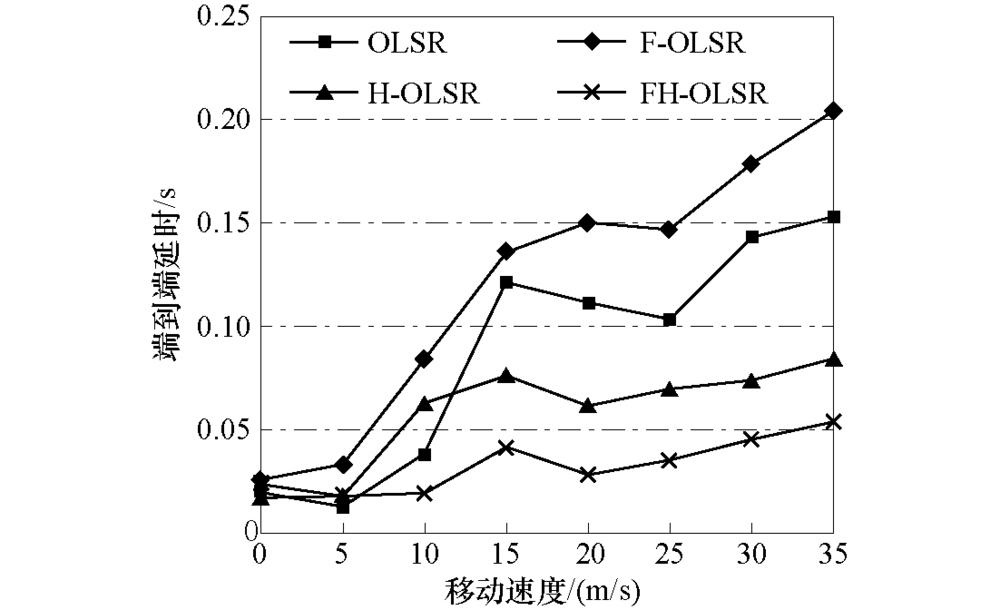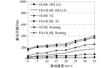 如图8所示, OLSR协议由于周期性发送消息, 消息发送量相对平稳.而FH-OLSR动态调整消息的发送频率与范围, 使得TC消息发送量降低, HELLO消息发送量增加, 并且随着节点速度的增加, 路由开销相比于OLSR协议降低了约25%.如图9所示, 随着节点移动速度的增加, 节点的平均端到端延时的差距逐渐增加.当节点移动速度低于10 m/s时, 延时相差不多, 但超过15 m/s时, FH-OLSR协议的延时明显低于其余3种协议, 这是因为FH-OLSR协议不仅能够迅速感知邻居状态, 选出有效路由, 同时也能够降低路由开销, 减少由于信道堵塞而造成的等待延时.