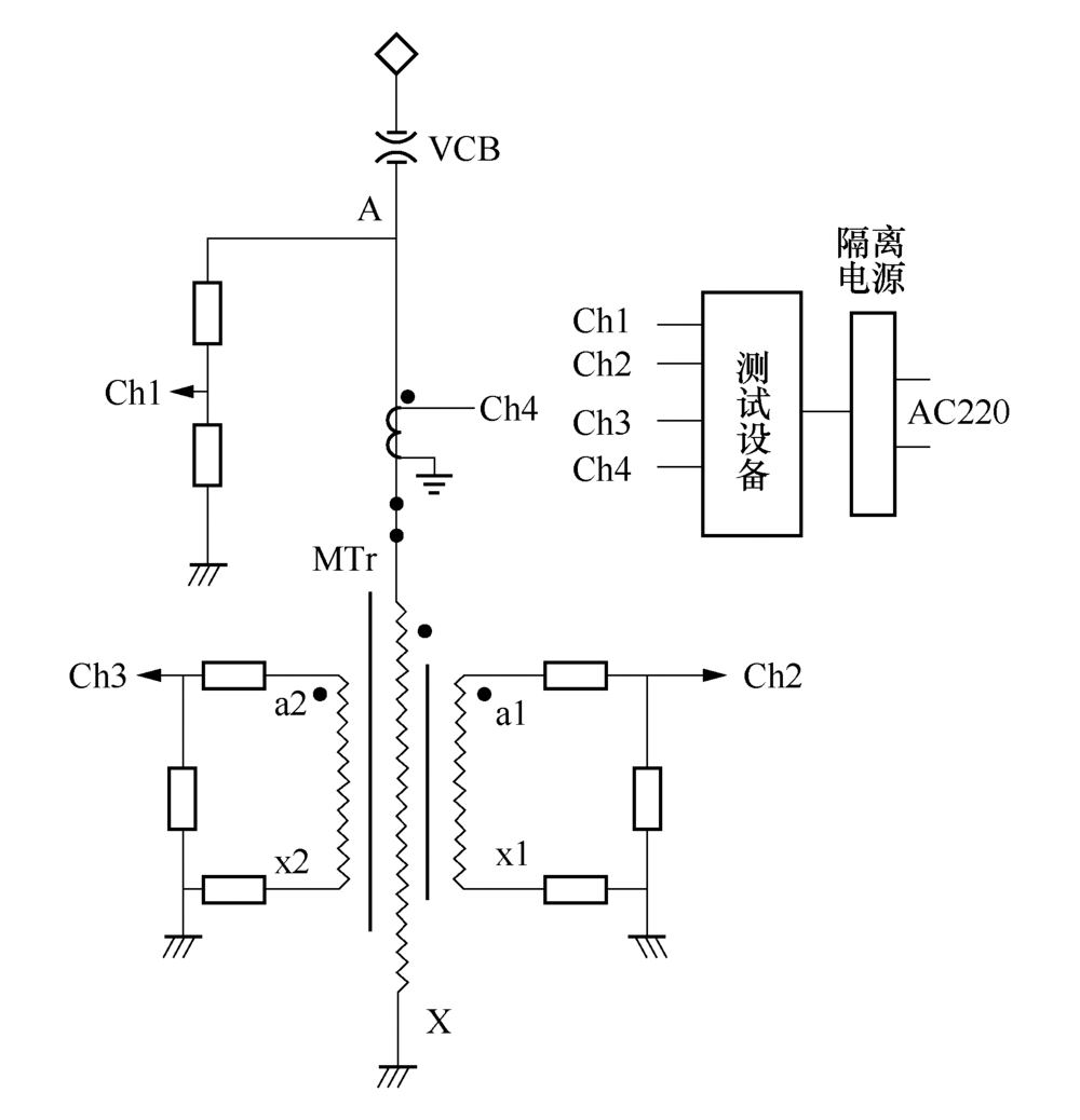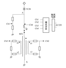 为充分了解中国标准动车组空载合闸的涌流特性, 分别对两列8辆编组的动车组CRH0503及CRH0207主断路器进行合闸操作, 每列动车组分别合闸15次并记录整个过渡过程波形, 测试设备安装原理如图2所示.图2中Ch1通道测试为主变压器原边电压, Ch2和Ch3测试分别为次级绕组1和2电压, Ch4测试为主变压器合闸涌流.