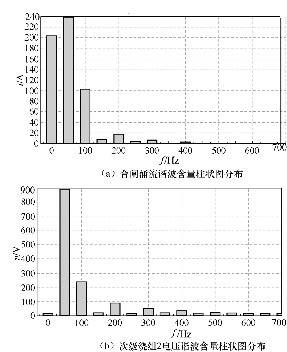 | 表3 最大涌流时合闸瞬态第1个周波谐波分析 Tab.3 First wave harmonic analysis under the maximum inrush current |