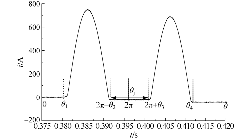 由式(11)看出, 励磁涌流间断角与变压器的磁通稳态分量幅值(电压幅值)、合闸角度和铁心剩磁有关.变压器饱和越厉害, 励磁涌流间断角就越小.