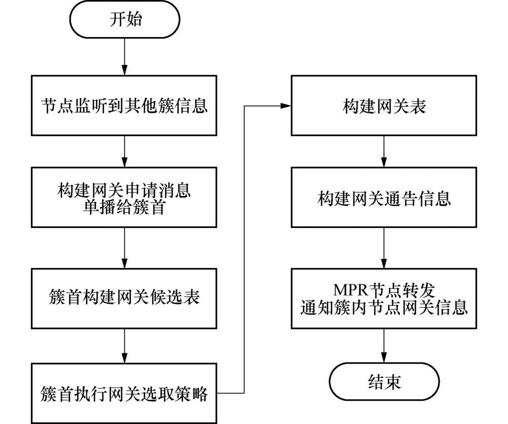3)网关节点不会选为多点中继(Multi Point Relay, MPR)节点发送拓扑控制(Topology Control, TC)消息, 防止TC消息出簇, 网关成为瓶颈, 保证网络的安全.