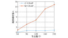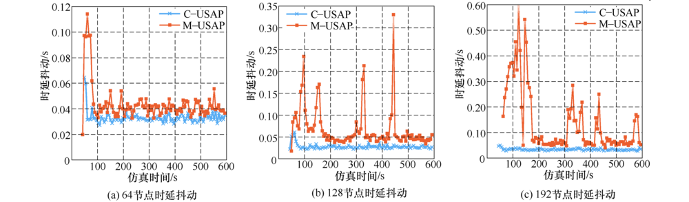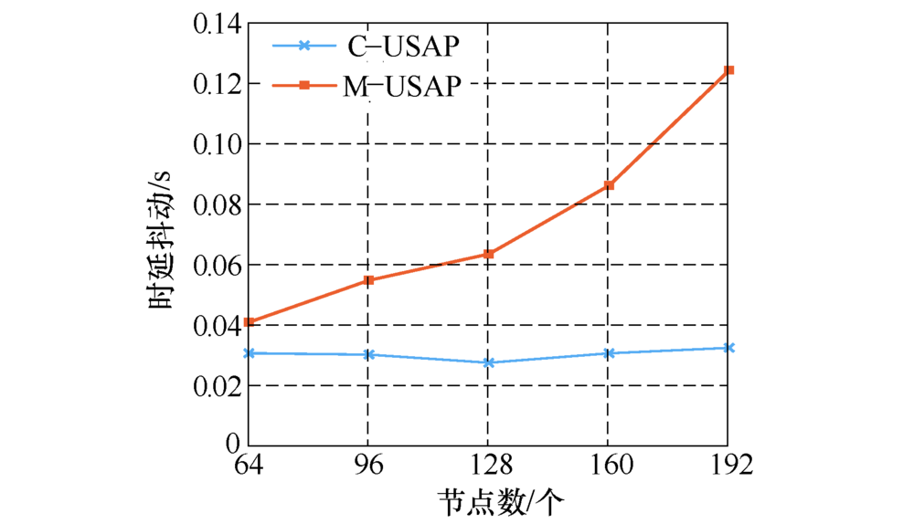 图11中在网络规模为64节点时, M-USAP与C-USAP协议业务接收量平稳.在网络规模为128、192节点时, M-USAP协议出现大量抖动, C-USAP接收量保持平稳.图12中在同等规模下, M-USAP时延抖动大于C-USAP.且随着网络规模的增大, M-USAP业务接收量不稳定, 出现大幅度抖动.