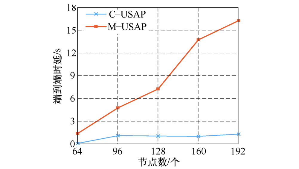 2)端到端时延.图14为网络加载100 kbits/s业务流时, 节点数为64、128、192情况下M-USAP与C-USAP端到端时延对比.图15为节点不断变化情况下, M-USAP、C-USAP协议端到端时延性能对比.网络刚开始进行仿真即初始组网过程, 节点未接收业务, 时延增大; 路由收敛, 节点接收业务, 时延减小趋于平稳.图14中在网络规模为64节点时, M-USAP时延约为1 s, C-USAP时延约为0.4 s.在网络规模为128节点时, M-USAP时延约为2.5 s, C-USAP时延约为1 s.在网络规模为192节点时, M-USAP时延很大, C-USAP时延约为1.2 s.M-USAP时延明显大于C-USAP.