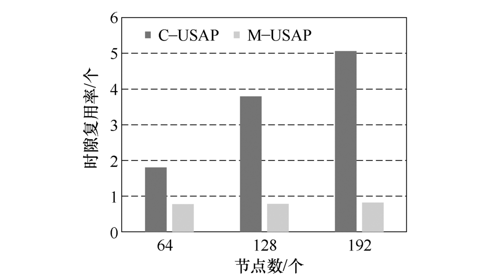 3)时隙复用率.图16为对网络加载100 kbits/s的IP业务流、节点数为64、96、128时, M-USAP与C-USAP协议时隙复用率对比.C-USAP协议与M-USAP协议申请时隙时遵循两跳之外复用原则.路由收敛, 节点根据业务流来计算分配时隙数量.M-USAP协议中 T=2S, S为网络中所有节点个数, C-USAP协议