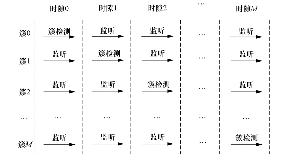 在子网间探测帧, 帧内时隙数与簇的个数相同, 每个簇占用一个时隙.所有节点在不同时隙统一切频到占用当前时隙的簇频率, 各簇的所有节点在本簇占用的时隙发送簇检测包(cluster-detect), 在其他时隙监听其他簇的检测包进行邻居发现, 每个节点可以同时接收多个检查包.如图3所示, 簇