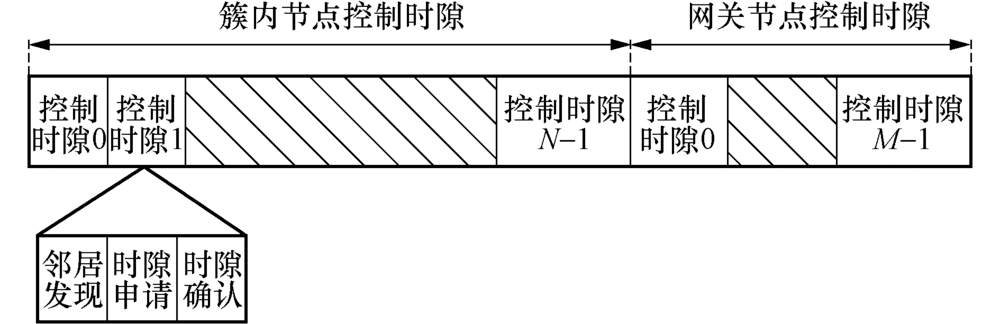 2)簇内控制帧普通节点工作在本簇, 网关节点偶数帧工作在本簇, 奇数帧工作在对簇.在本节点所属控制时隙发送邻居发现(NMOP0)、时隙申请(NMOP1)和时隙确认(ACK包), 用于节点申请数据时隙.