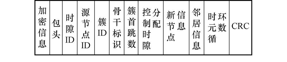 簇内控制帧结构如图4所示.簇内控制帧主要用于邻居发现、时隙申请、时隙确认, 交换与更新节点存储的消息表, 根据传输情况来分配时隙, 并了解剩余可用的时隙情况.