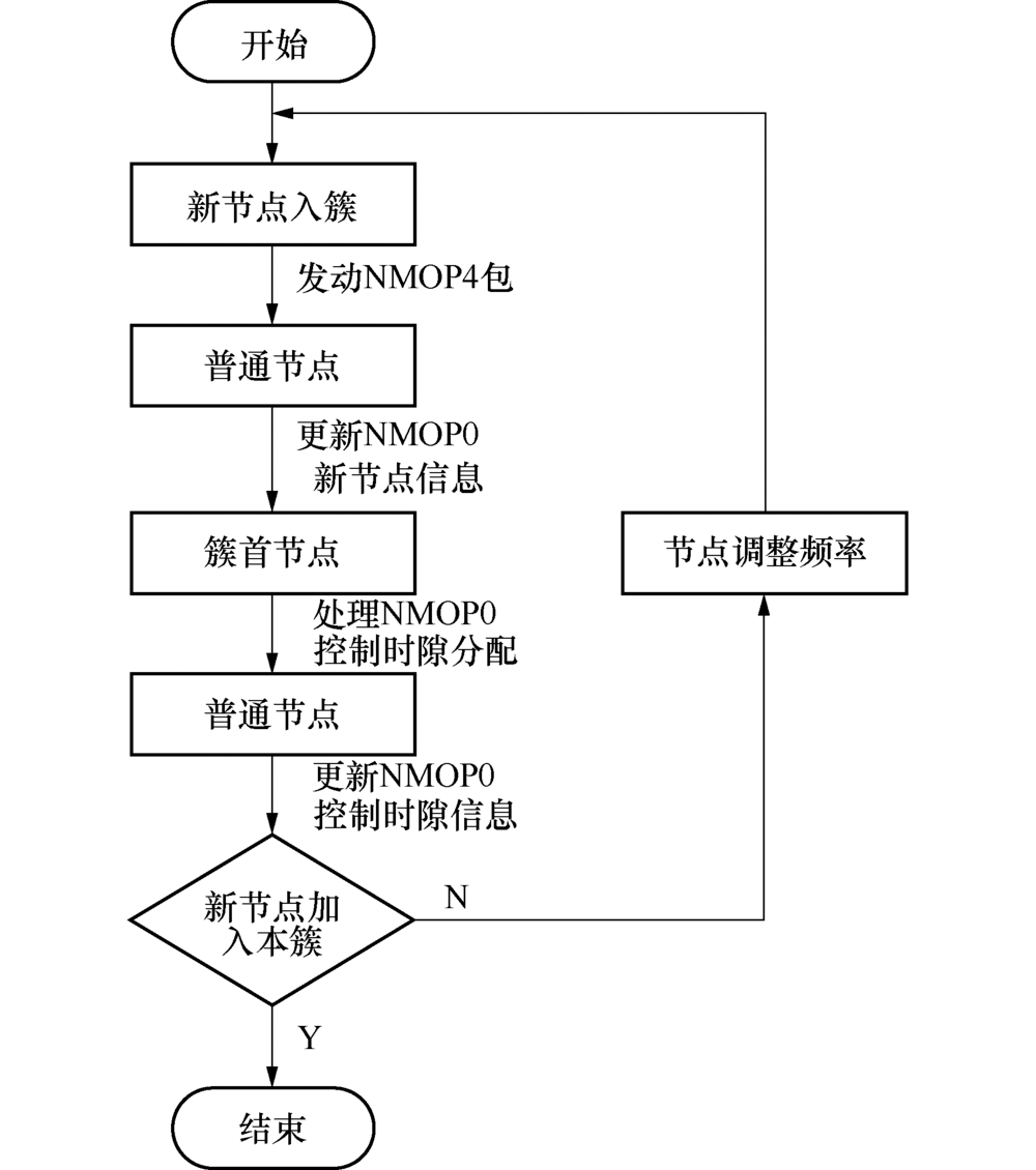 网关节点根据时元循环数进行切频, 偶数帧工作在本簇, 奇数帧工作在对簇.新节点入簇时, 考虑网络负载, 簇内节点最大数因素, 每次最多允许4个节点入簇.新节点在簇间控制时隙发送NMOP4包, 簇首收到NMOP4包, 根据本簇资源剩余情况和网络负载对申请加入本簇的节点的准入性进行仲裁并分配控制时隙.距离簇首