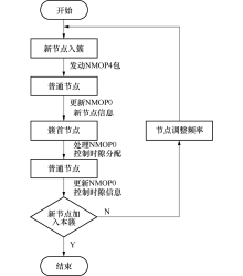 簇首跳数为本节点离簇首的跳数, 根据收到邻居节点的NMOP0包进行比较更新处理获得; 邻居信息是本节点收到邻居节点的NMOP0包, 本节点将邻居节点作为自己的一跳邻居, 同时解析邻居节点的NMOP0包, 将邻居节点的一跳邻居信息作为自己的二跳邻居策略新建或更新邻居信息; 控制时隙分配是簇首根据收到的NMOP0包对新节点入簇进行控制时隙分配, 普通节点收到NMOP0包只对控制时隙分配信息进行转发; 收到NMOP4包的节点更新NMOP0中新节点信息, 其余节点进行转发.