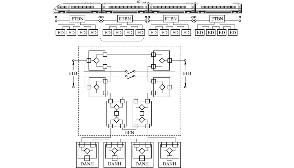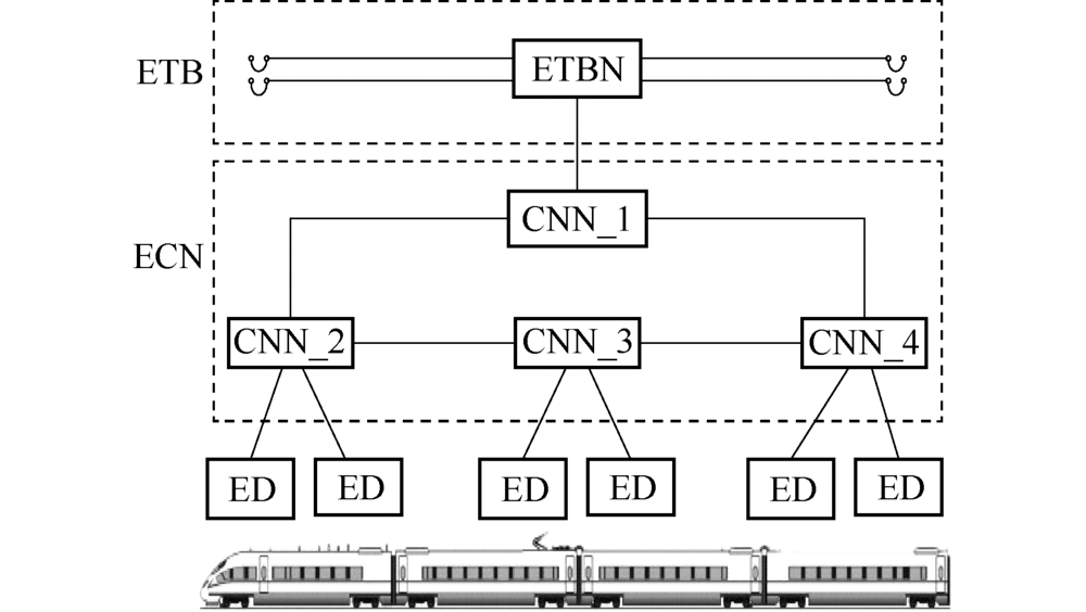列车通信网络由两层网络组成, 分别是列车骨干网络(Ethernet Train Backbone, ETB)和列车编组网(Ethernet Consist Network, ECN).ETB负责整个列车范围内的通信, 并实现列车拓扑发现协议, 它由骨干网节点(Ethernet Train Backbone Node, ETBN)构成, 采用线形拓扑结构.ECN由组网节点(Consist Network Node, CNN)构成, 负责列车组网内的通信.车载终端设备通过CNN连接到ECN, 每个车辆编组内的ECN通过ETBN连接至ETB, 从而实现车辆编组之间的通信.现阶段广泛采用基于RSTP的TCN冗余拓扑如图1所示.图1中ED(End Device)为终端智能设备.